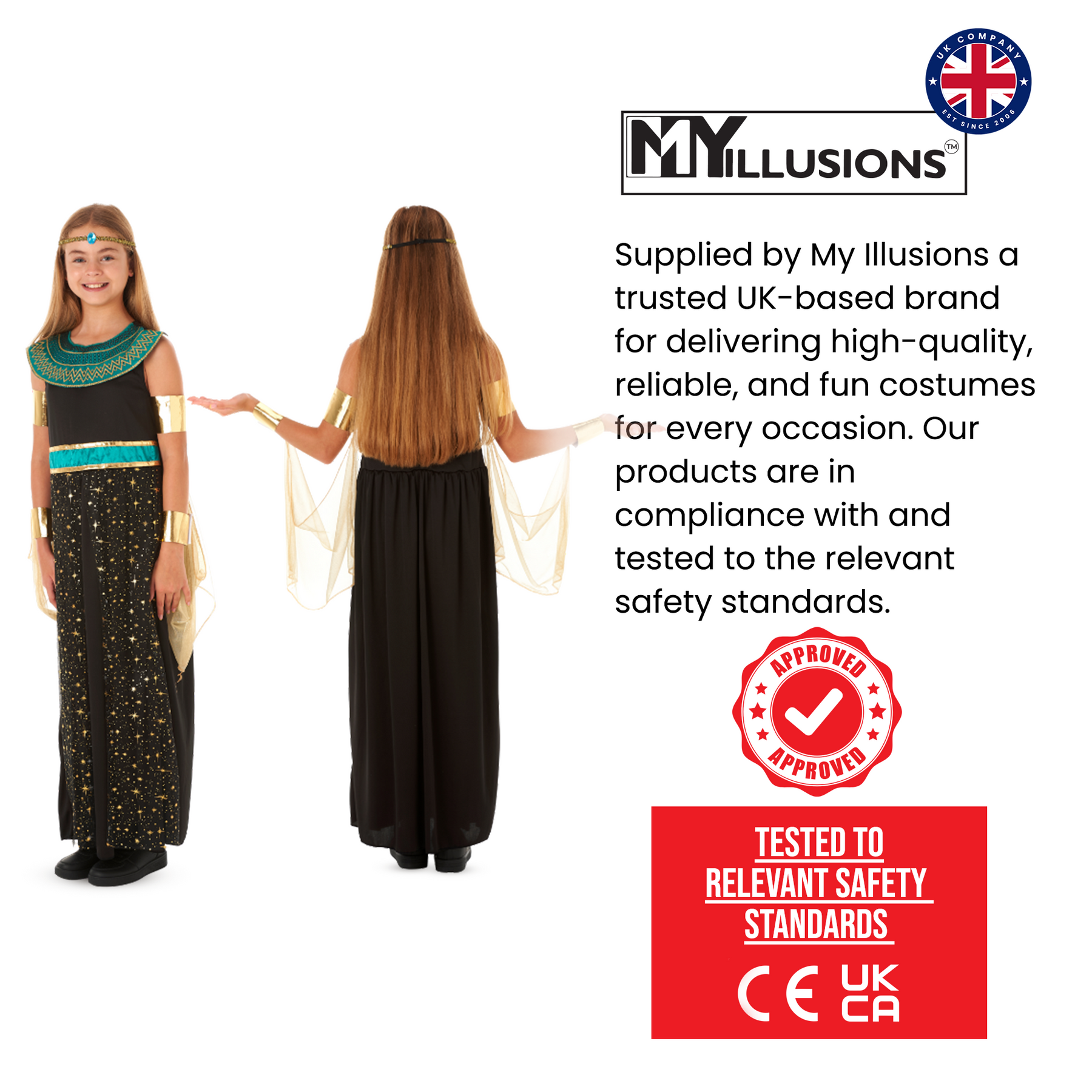 Transform into the legendary Queen of the Nile with our dazzling Girls Cleopatra Costume. Our girls' Egyptian fancy dress is the perfect choice for little history lovers who dream of ruling Ancient Egypt! Whether it’s for World Book Day, school plays, themed parties, or fun fancy-dress events, this stunning outfit transports children straight to the golden age of pyramids, pharaohs, and powerful queens.
